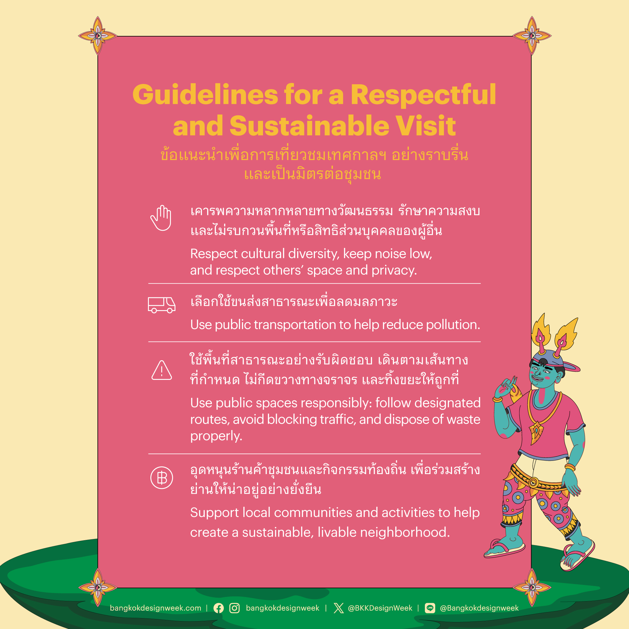 ก่อนออกเดินเที่ยว Bangkok Design Week 2026 อย่าลืมแวะอ่านข้อตกลงเล็ก ๆ สักนิด เพื่อให้การเที่ยวชมราบรื่น สนุก และไม่รบกวนคนรอบข้าง เพราะทุกพื้นที่คือชุมชนที่มีผู้คนใช้ชีวิตอยู่จริง และการใส่ใจกันเล็กน้อยช่วยให้เทศกาลเป็นมิตรต่อทั้งชุมชนและเมือง
