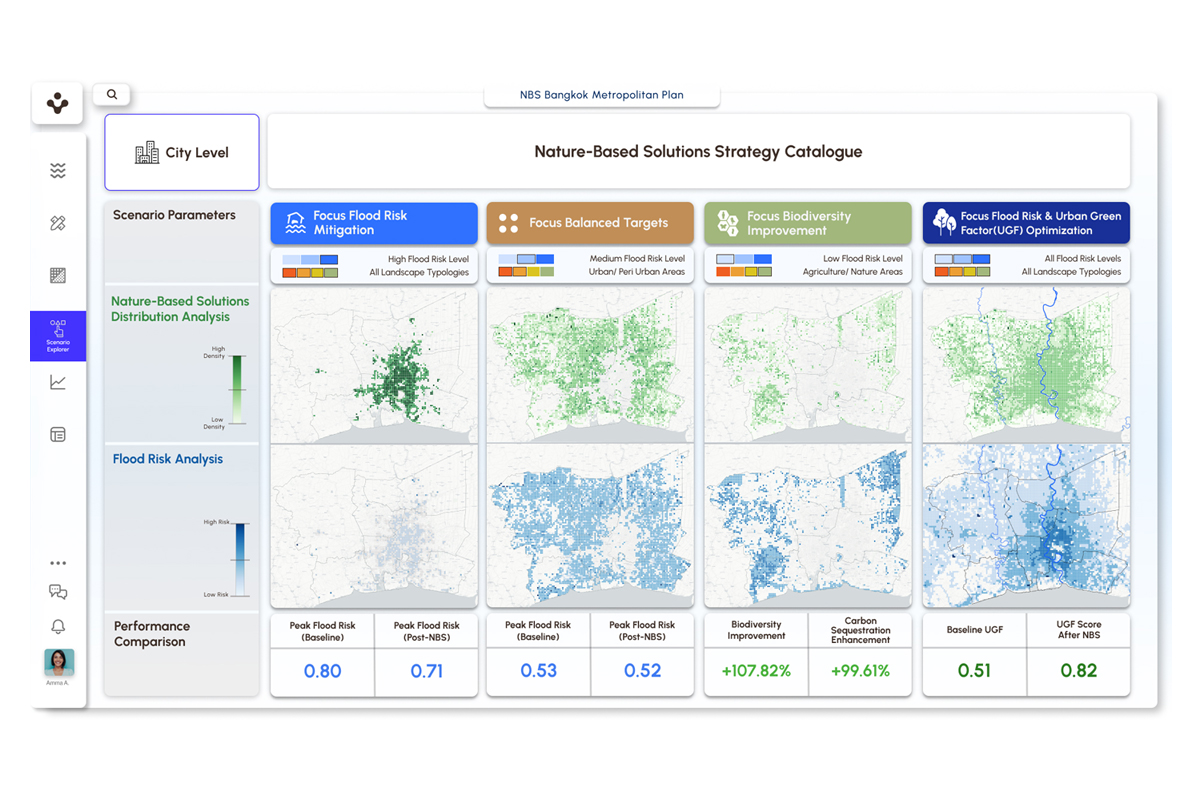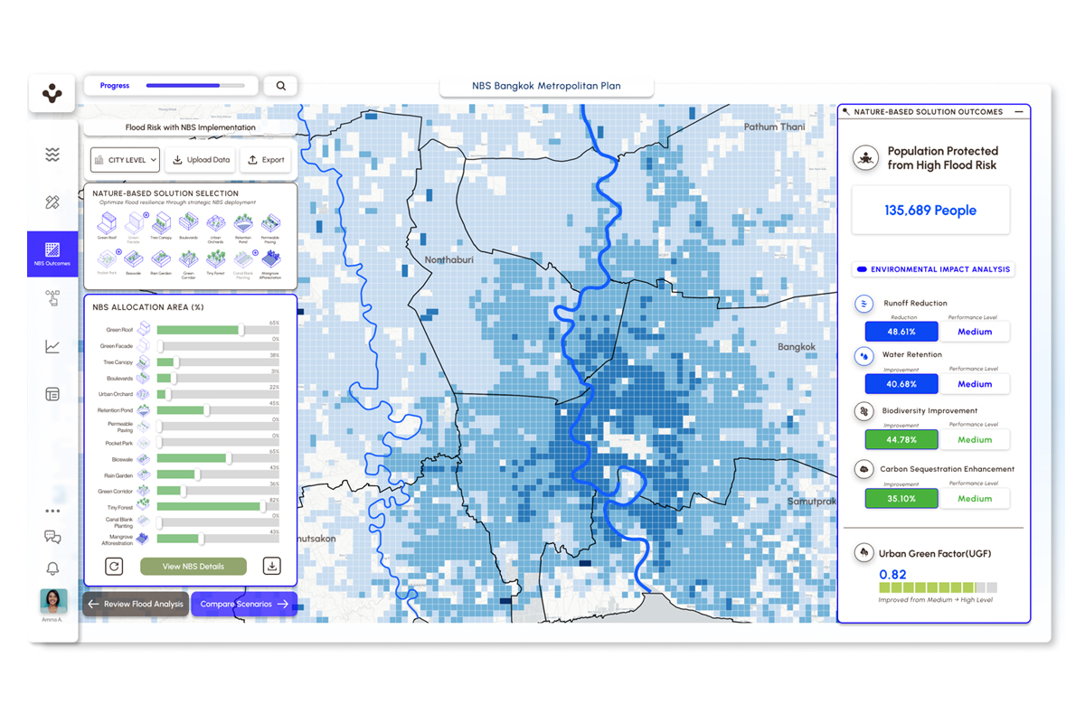 ในกรณีศึกษาพื้นที่กรุงเทพมหานครและปริมณฑล AQUA.NEST ใช้กริดขนาด 1 × 1 กม. เพื่อประเมินความเหมาะสมของ NBS ในพื้นที่เมือง ชานเมือง และการเกษตร ผลการจำลองพบว่า ป่าขนาดเล็ก (Tiny Forests) สวนรับน้ำ (Rain Gardens) และร่องน้ำชีวภาพ (Bioswales) เป็นมาตรการที่มีประสิทธิภาพสูงสุด โดยสามารถช่วยลดความเสี่ยงจากอุทกภัย พร้อมสร้างประโยชน์ร่วม เช่น การเก็บกักน้ำ การเพิ่มความหลากหลายทางชีวภาพ และการดูดซับคาร์บอน ในการทดลองนำร่อง เครื่องมือนี้สามารถสนับสนุนมาตรการที่ช่วยปกป้องประชากรได้ 135,689 คน หรือ 1.59% ของผู้ที่อยู่ในความเสี่ยงรวม 8.53 ล้านคน