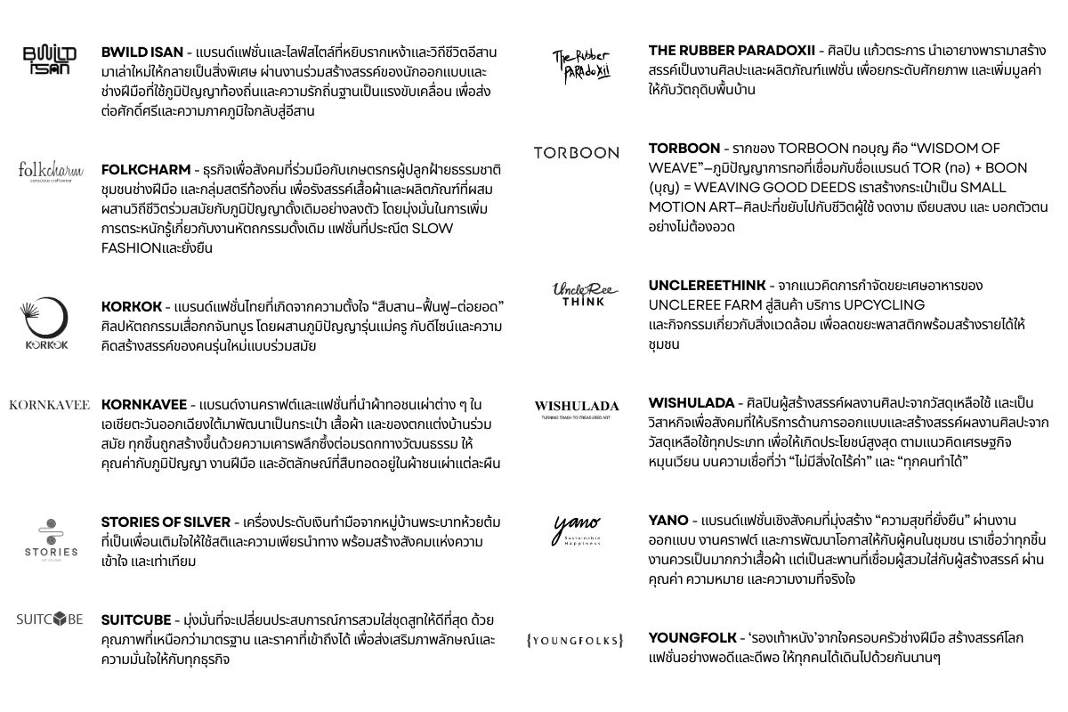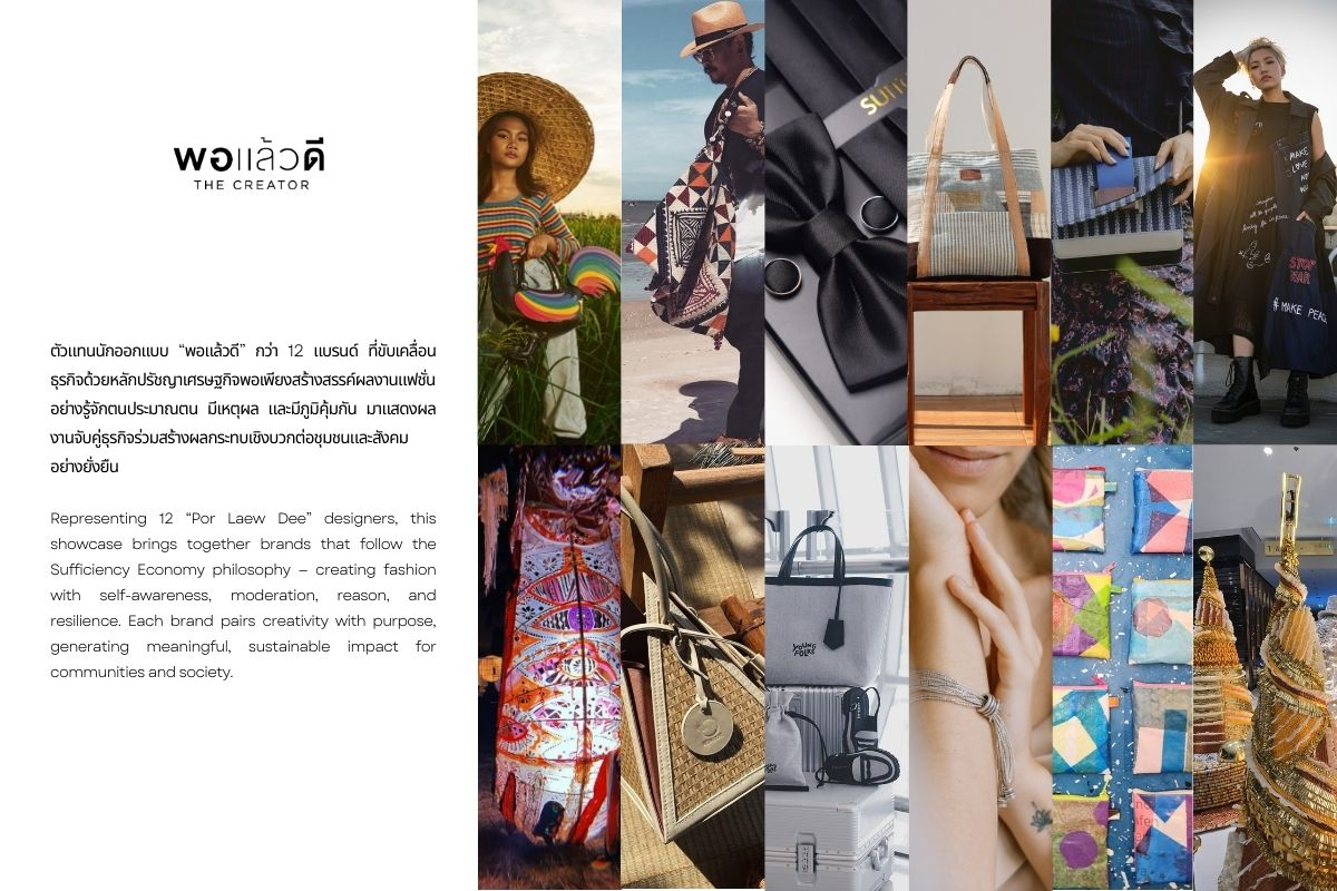 ตัวแทนนักออกแบบ "พอแล้วดี" กว่า 12 แบรนด์ ที่ขับเคลื่อนธุรกิจด้วยหลักปรัชญาเศรษฐกิจพอเพียง สร้างสรรค์ผลงานแฟชั่นอย่างรู้จักตนประมาณตน มีเหตุผล และมีภูมิคุ้มกัน มาแสดงผลงาน จับคู่ธุรกิจร่วมสร้างผลกระทบเชิงบวกต่อชุมชนและสังคมอย่างยั่งยืน