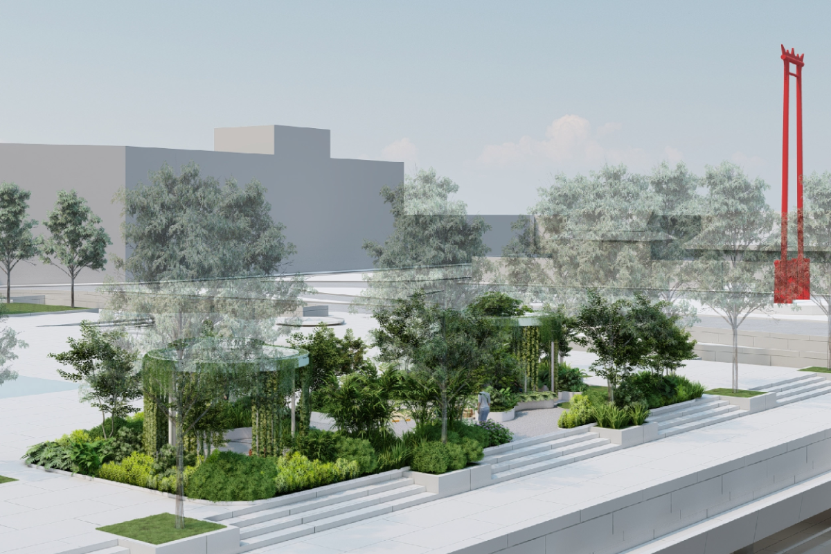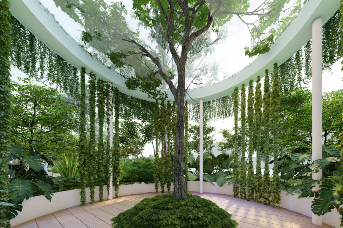 อุณหภูมิภายนอกร้อนขึ้นทุกวัน ซึ่งความร้อนนำไปสู่ความไม่สะดวกสบาย และนำไปสู่ปัญหาสุขภาพในท้ายที่สุด ความร้อนยังส่งผลต่ออารมณ์และความเครียด ดังนั้นในเมืองที่ร้อนระอุ เต็มไปด้วยความวุ่นวาย ทุกคนต่างก็ต้องการพื้นที่ Heal ใจ ธรรมชาตินับว่าเป็นหนึ่งในเครื่องมือที่อยู่ใกล้ตัวเรา ให้ใจเราเย็นลงและผ่อนคลาย "Urban (Fo)rest" พื้นที่ลานคนเมือง จะชวนทุกคนมาอาบป่าในเมืองเพื่อฟื้นฟูร่างกายและจิตใจ สร้างปฏิสัมพันธ์ระหว่างคนและสิ่งแวดล้อม ให้ธรรมชาติช่วยรักษาสมดุลสุขภาวะของมนุษย์ ผ่านงานออกแบบที่จะเปลี่ยนพื้นที่ดาดแข็งของเมืองที่ร้อนและชืดชาให้กลายเป็นป่าขนาดย่อมที่ถูกยืดระยะ และพับไปมา จนเกิดเป็นพื้นที่ภายในหลากหลายรูปแบบ ให้เราได้ปฏิสัมพันธ์กับธรรมชาติง่ายๆ ไม่ว่าจะมองเห็น ฟังเสียง ดมกลิ่น และสัมผัส