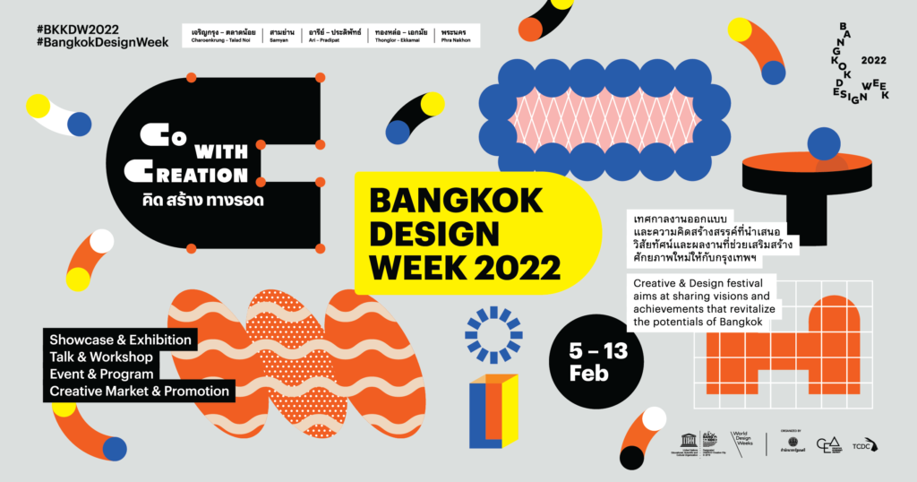 Bangkok Design Week 2022 is getting closer. This year comes with a new festival setup both online where anyone can easily access and onsite that brings you to explore new and interesting designs. You can wander around the small allies scattered throughout the 5 districts in Bangkok. In the past, the festival has been to Charoenkrung – Talad Noi, Samyan, Ari – Pradipat, and Thonglor – Ekkamai but we’re back this year! with another district like Phra Nakhon and creative venues throughout Bangkok. You can say it’s the most diverse program we’ve ever had. You will get to see new possibilities in a variety of contexts and for sure feel the unique charms each district presents. Get ready to meet the 5 districts that will be brightening up in Bangkok Design Week 2022 with the theme “Co With Creation” from 5-13 Feb 2022. Co Between Online and Onsite Bangkok Design Week 2022 is still full of interesting programs and a variety of creative works. In which, this year the onsite programs have to be reduced to maintain the health and safety regulations. But the fun and colourful works are not going anywhere because we have taken some of the programs online. So that everyone gets a chance to join Bangkok Design Week this year and see them from anywhere. The Main Co-operation is Centred at “Charoenkrung – Talad Noi” “Charoenkrung – Talad Noi” district is still the main centre of the festival like other years and is the district with the most works. Be ready for many highlight programs scattered throughout the district. We invite you to come to explore and look for creativity hidden in the district together. The main exhibition venues – Elton House – Broccoli Revolution Charoen Krung – Heliconia Bangkok | เฮลิโคเนีย กรุงเทพฯ – O.P. Garden | โอ.พี. การ์เด็น – Central: The Original Store – Marine Police Lodging | บ้านพักตำรวจน้ำ – Haroon Mosque Community | ชุมชนมัสยิดฮารูน – Ten Fingers Factory and Design Co., LTD – Darunbannalai Children’s Library | ดรุณบรรณาลัย ห้องสมุดเด็กปฐมวัย – Soi Charoenkrung 34 | ซอยเจริญกรุง 34 – Grand Postal Building, Charoenkrung Road | อาคารไปรษณีย์กลาง ถนนเจริญกรุง – TCDC Bangkok | TCDC กรุงเทพฯ – Hēi Jīi | เฮจิ – Charoen 43 Art & Eatery | เจริญ 43 อาร์ท แอนด์ อีทเทอร์รี่ – Warehouse 30 | โกดัง 30 – JOJO Cafe – ATT 19 | แอท ไนน์ทีน – Same Old Days – River City Bangkok | ริเวอร์ ซิตี้ แบงค็อก – Mad Sugar Home Cafe’ – Yip In Tsoi | ยิบอินซอย – Khlong Phadung Krung Kasem, Mahapluetharam Road | คลองผดุงกรุงเกษม ถนนมหาพฤฒาราม – Chai Phatthanasilp | ชัยพัฒนศิลป์ – Talad Noi Community | ชุมชนตลาดน้อย – Patina Bangkok | พาทีน่า แบงค็อก – Mother Roaster – Soi Charoenkrung 22 | ซอยเจริญกรุง 22 – Baan Rim Naam, Talad Noi | บ้านริมน้ำ ตลาดน้อย – The So Heng Tai Mansion | บ้านโซวเฮงไถ่ – Hong Sieng Kong | ฮงเซียงกง – Puey Park | สวนป๋วย (ท่าน้ำภาณุรังษี) – Recordoffee | เรคคอดอฟฟี่ – DINSOR | ดินสอ – San Chao Rong Kueak | ศาลเจ้าโรงเกือก Co With Districts Brighten Bangkok Allover Other than “Charoenkrung – Talad Noi”, some programs are scattered in 3 other districts with different characters. Like Samyan, Ari – Pradipat, and Thonglor – Ekkamai and other venues throughout Bangkok that have brightened up with the festival in the past years. Having worked in a variety of districts allows us to explore designs along with unique charms from each district. This also includes getting to know the people, local shops, well-known and distinctive shop owners in the districts as well. Co With New District “Phra Nakhon” This year’s special is the introduction of the new district “Phra Nakhon”, which also has programs on display. Brightening up the oldest district in Bangkok with fun questions that challenge the possibilities in the ‘Co-operation’ of the old town district, full of histories and stories, with creative ideas in many aspects of the city. #BKKDW2022 #BangkokDesignWeek #CoWithCreation