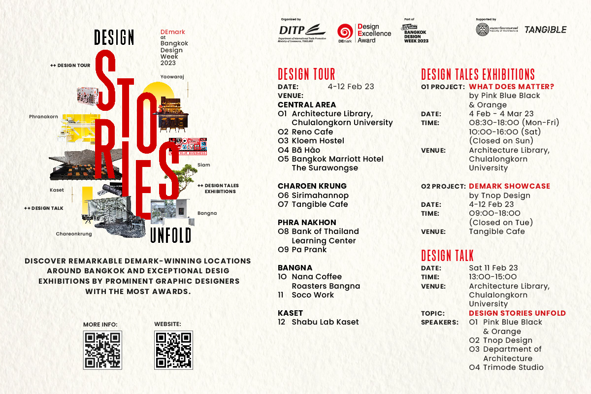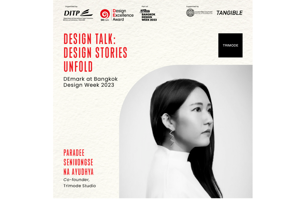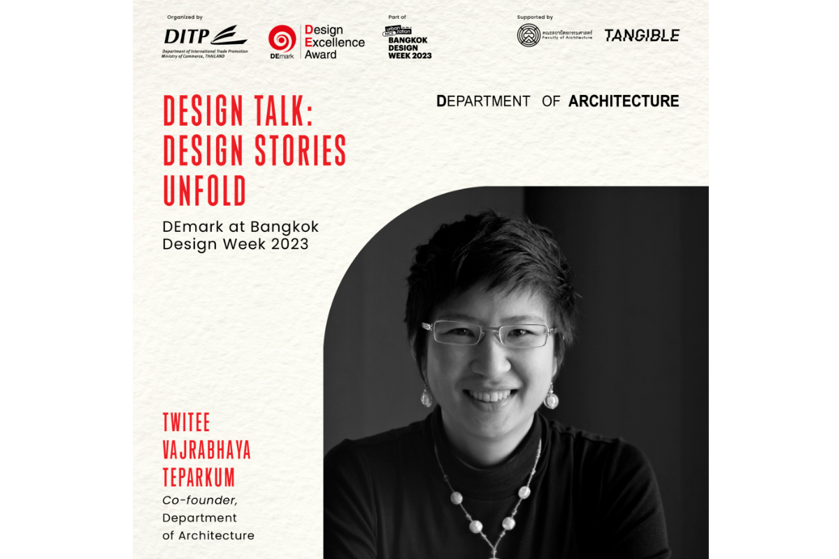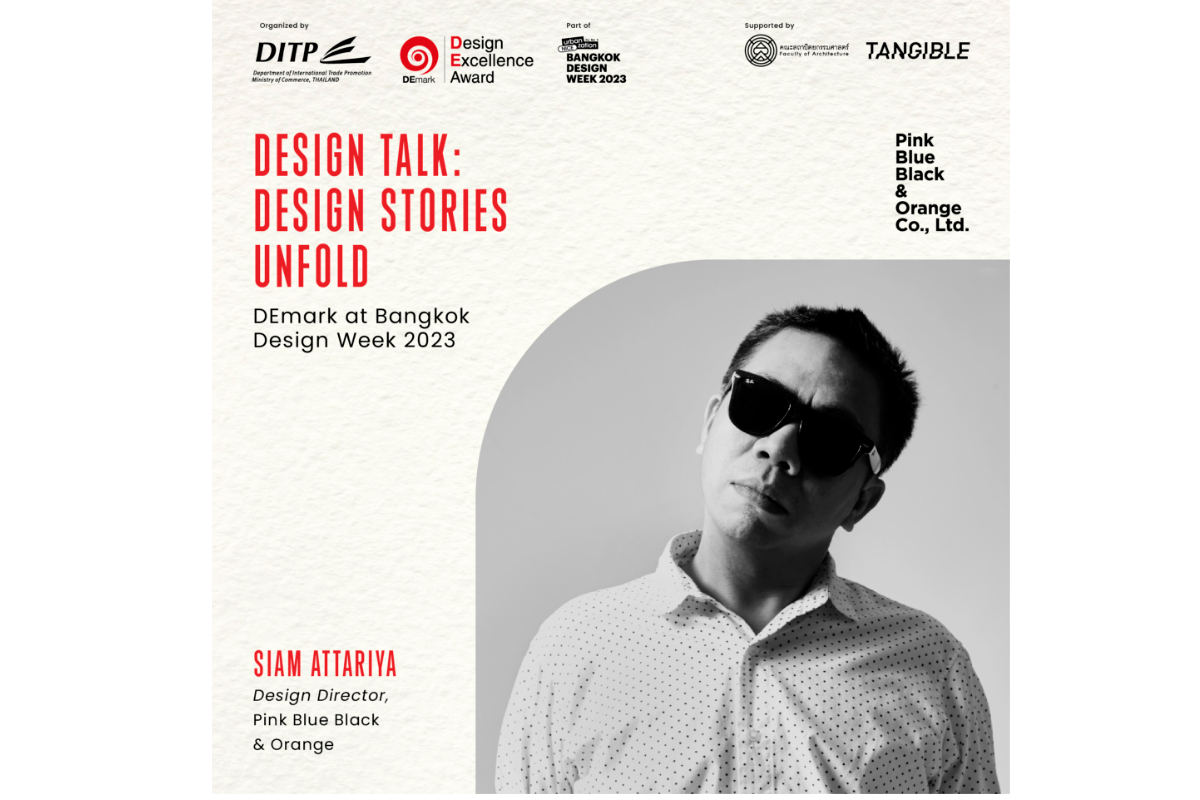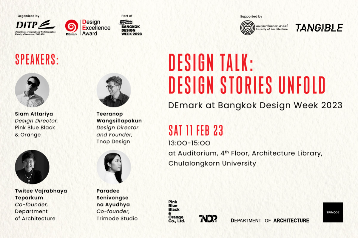 Design Excellence Award (DEmark) brings inspiration to Bangkok Design Week 2023 with a triad of activities to whet one’s creative appetite. Design Talk (Sat 11 Feb 23, 13:00-15:00, Architecture Library, Chulalongkorn University) goes behind the scenes of the creative process, featuring 4 DEmark-winning designers: 2 graphic designers and 2 interior designers; Siam Attariya (Pink Blue Black & Orange), Teeranop Wangsillapakun (Tnop Design), Twitee Vajrabhaya Teparkum (Department of Architecture), Paradee Senivongse na Ayudhya (Trimode Studio).
