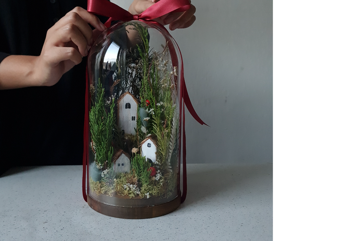 The flowers we use in glass dome decoration workshop were dried properly via suitable and meticulous techniques. Each flower branch was carefully selected, then categorized by size and shape before being preserved. Hanging upside-down in a well-ventilated area out of direct sunlight contributes to beautiful, long lasting natural color dried flowers. Flowers in glass dome suitable for home decoration or use as a special gift in many occasions.