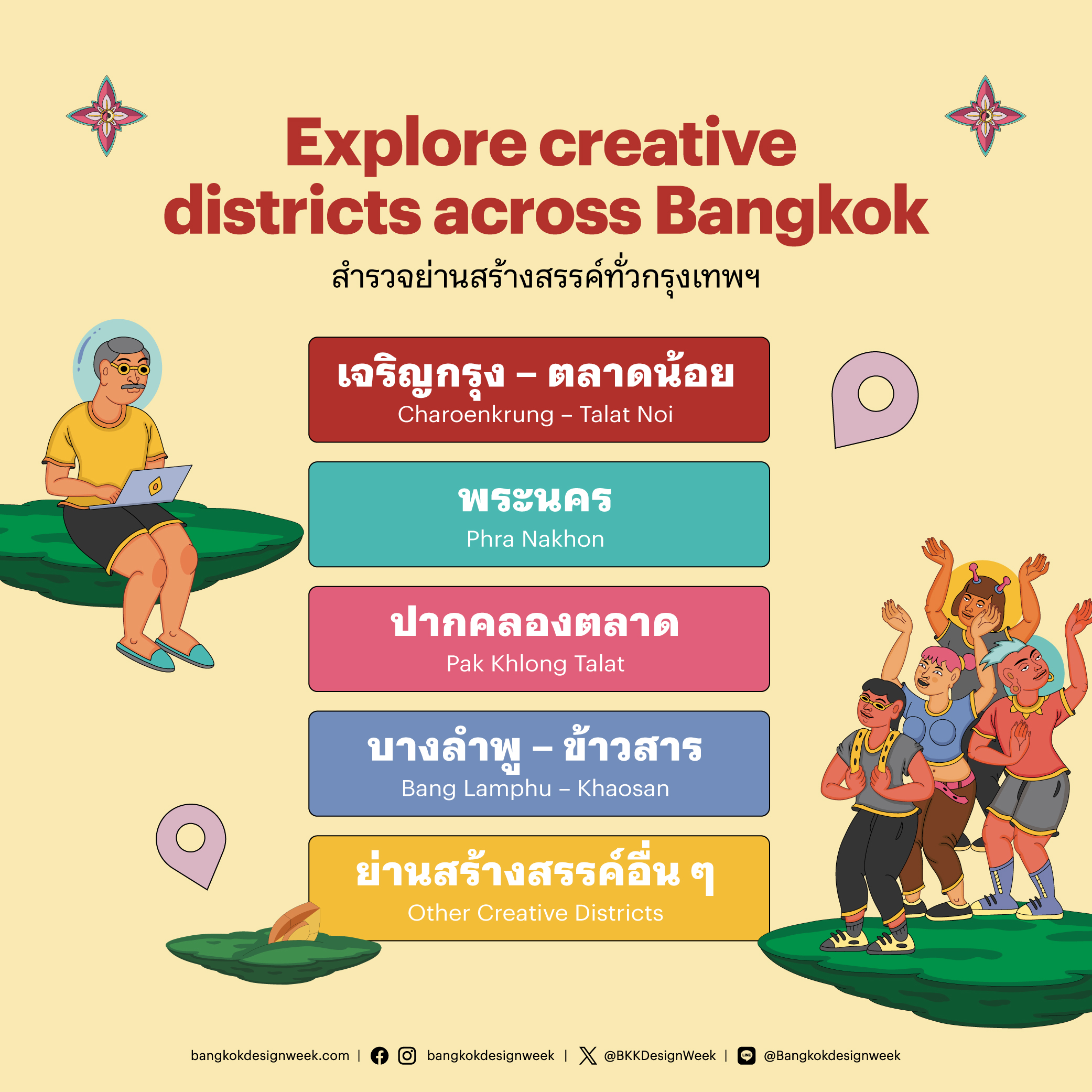 This year, Bangkok Design Week 2026 invites everyone to explore 4+1 creative districts across the city. Each area has its own character, stories, and design energy. Design works, activities, and highlight programs are deeply rooted in the local context, people, and everyday life of each neighborhood. Take a look at the concepts, pick your favorite districts, drop your pinsâand head out to collect ideas across the entire city.