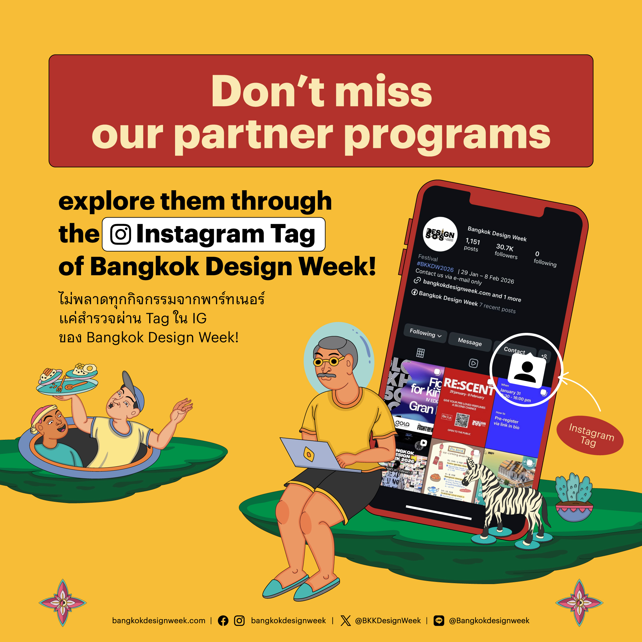 Activities at Bangkok Design Week 2026 take place simultaneously across the city, with many more partner programs waiting to be discovered. To stay up to date, simply check the Instagram Tag of Bangkok Design Week (the rightmost tab), where partner posts are gathered in real time. Youâll find new ideas, must-see programs, and festival atmosphere from many perspectives, making it easier and more enjoyable to explore the festival and catch all the highlights.