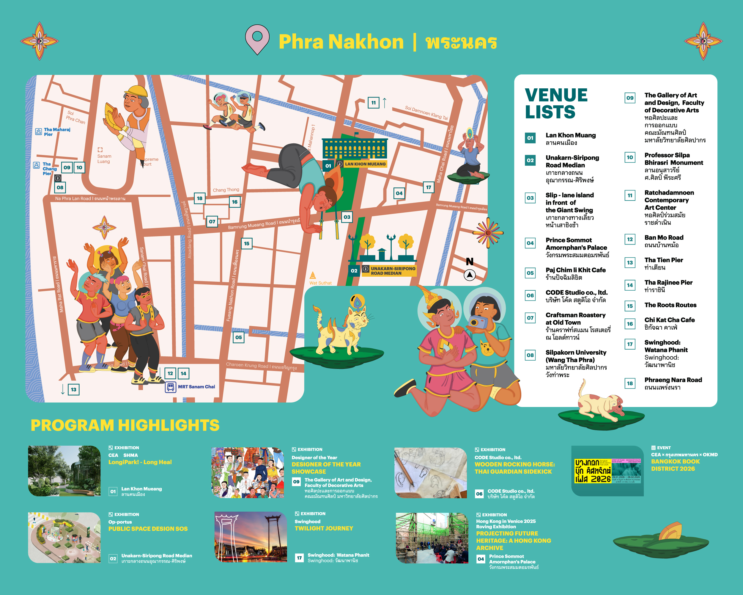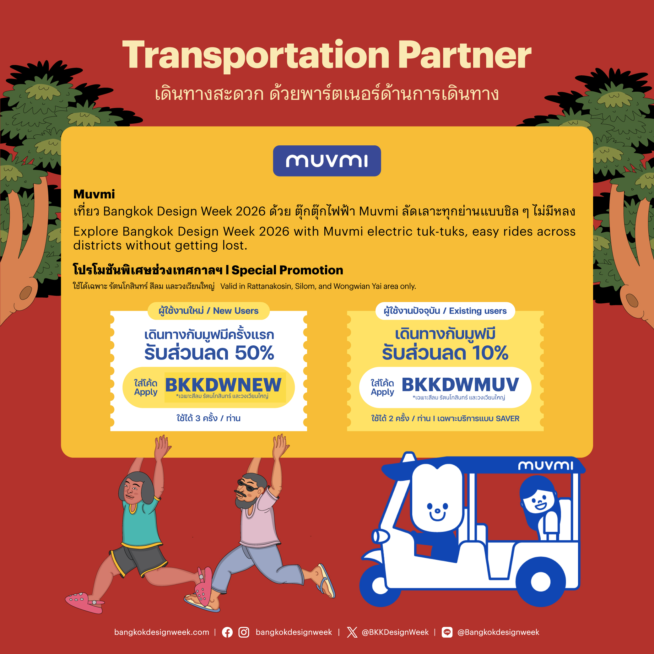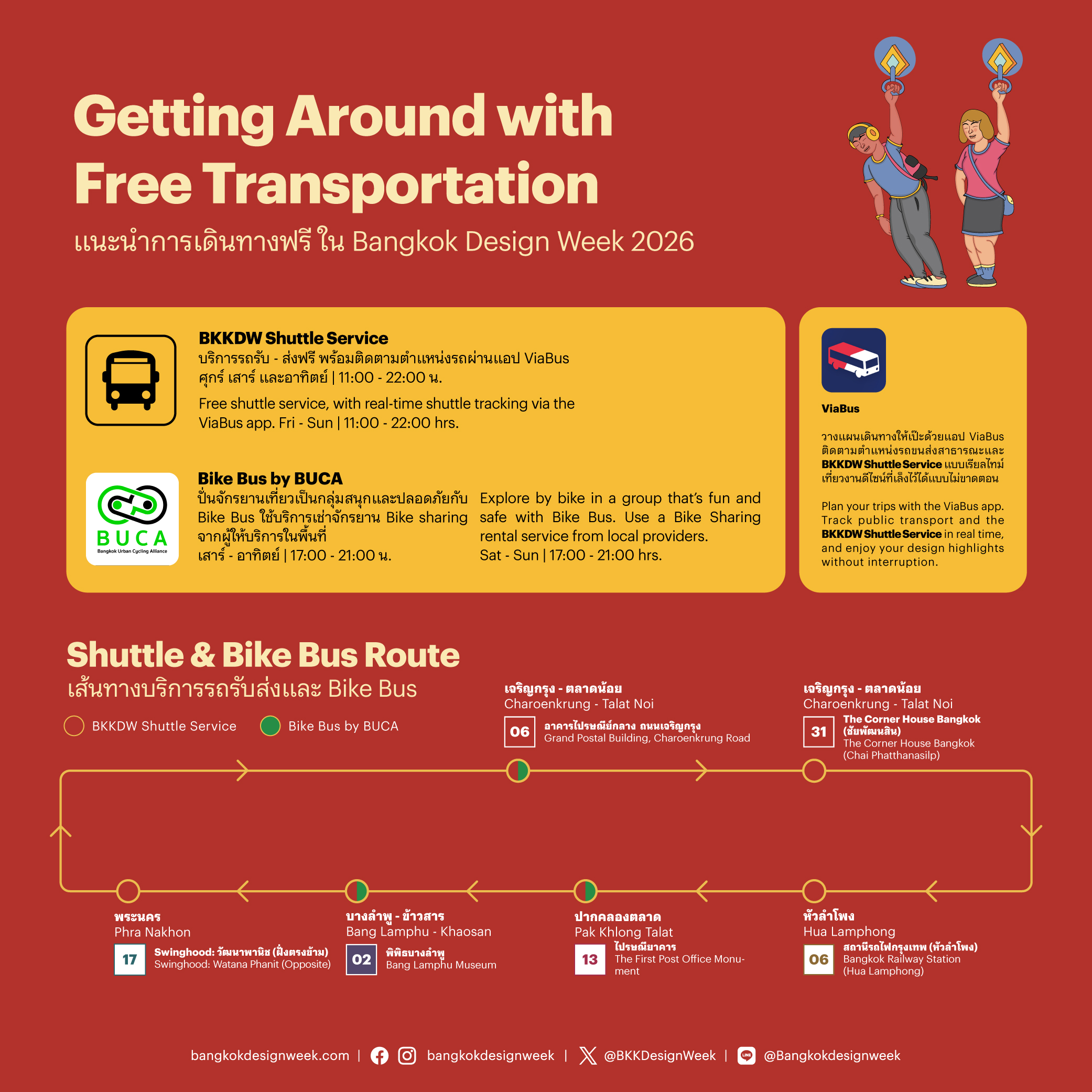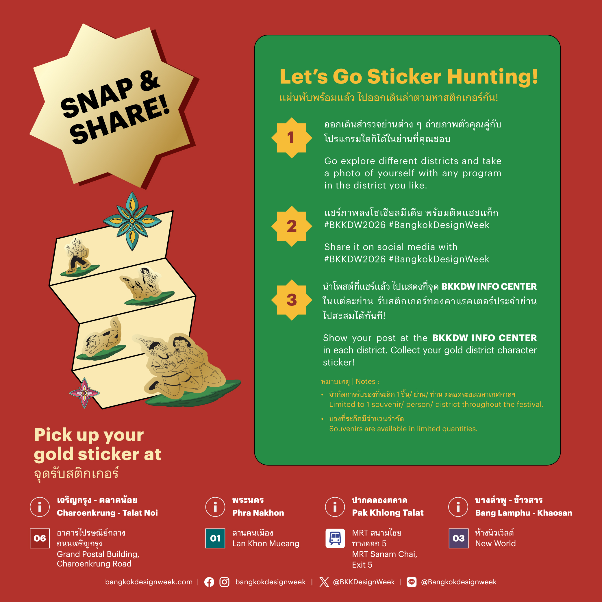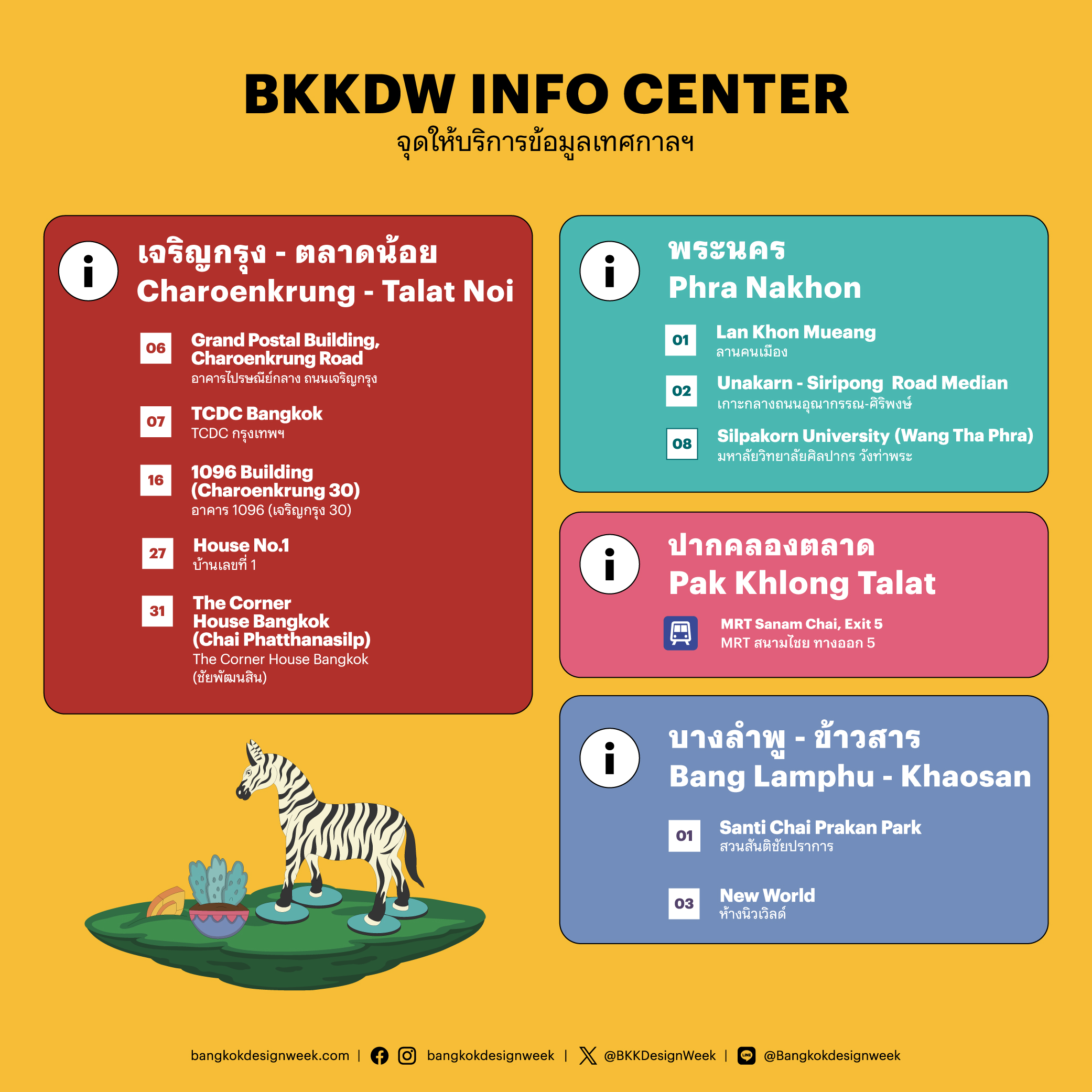No need to worry about getting lost – BKKDW INFO CENTER are available across all four main districts: CharoenkrungâTalat Noi (Grand Postal Building), Phra Nakhon (Lan Khon Mueang), Pak Khlong Talat (in front of MRT Sanam Chai, Exit 5), and Bang LamphuâKhaosan (in front of New World). The teams are there throughout the festival to help with routes, programs, and any information you need.