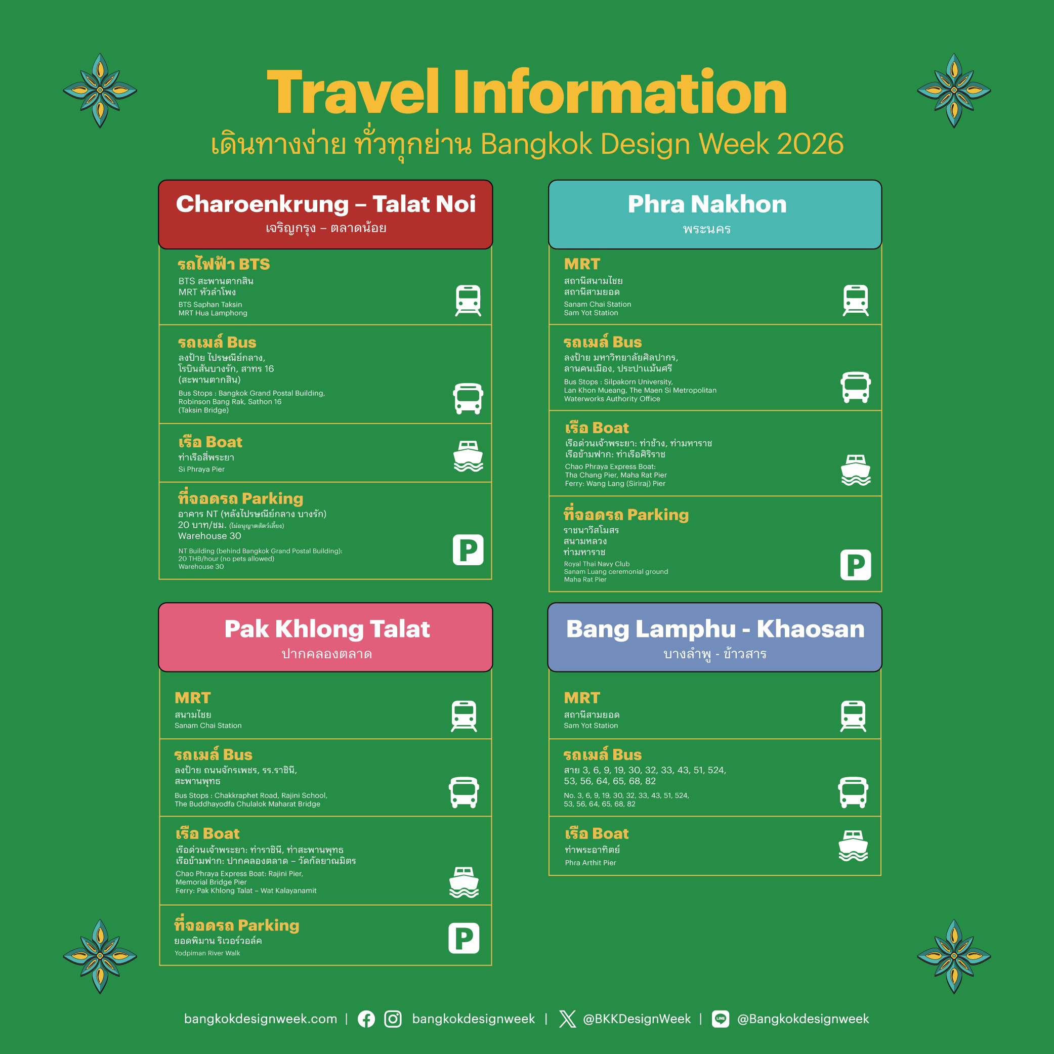 Save this image for later! Whether youâre arriving by BTS, bus, boat, or car, weâve gathered all transportation options and parking spots for all four creative districts, making it easy to plan your visit to Bangkok Design Week 2026.