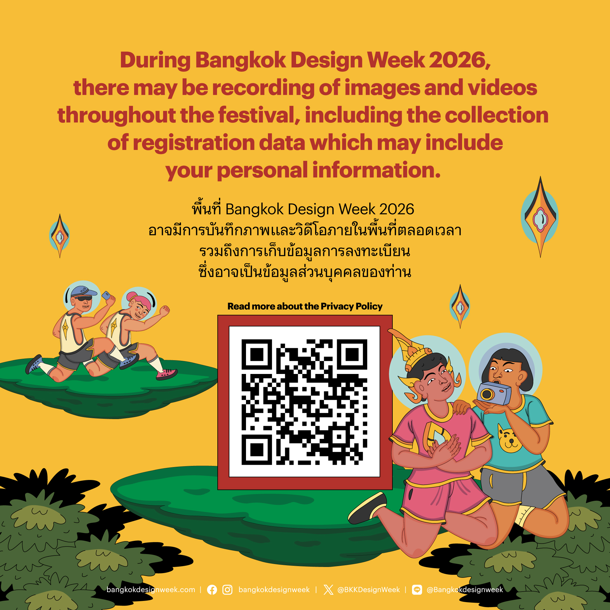 During Bangkok Design Week 2026 there may be recording of images and videos throughout the festival, including the collection of registration data which may include your personal information. The collection, processing, and disclosure of personal data are for various purposes as specified below. If you have any questions about the data collection, use, or disclosure of your personal information, the duration for which the office will retain your personal data, the methods of storage and security standards for your personal data, or about your rights regarding personal data, including the right to withdraw consent, you can refer to the Privacy Policy or email the personal data protection officer: dpo@cea.or.th