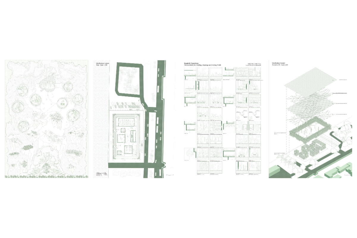 This studio explores the physical “patterns” of Bangkok, employing the process of pattern formation as a strategy for creating urban spaces and architectural forms that support the city’s identity. Development involves surveying, recording, analyzing, and synthesizing findings through diagrams, models, and architectural drawings. Students identified key elements—such as shophouses, street vendors, signage, roofs, verandas, Tom Yum, and trees—that reflect Bangkok’s identity. These elements were synthesized under thematic directions and further developed into the final architectural project, the Bangkok Meditation Hub.