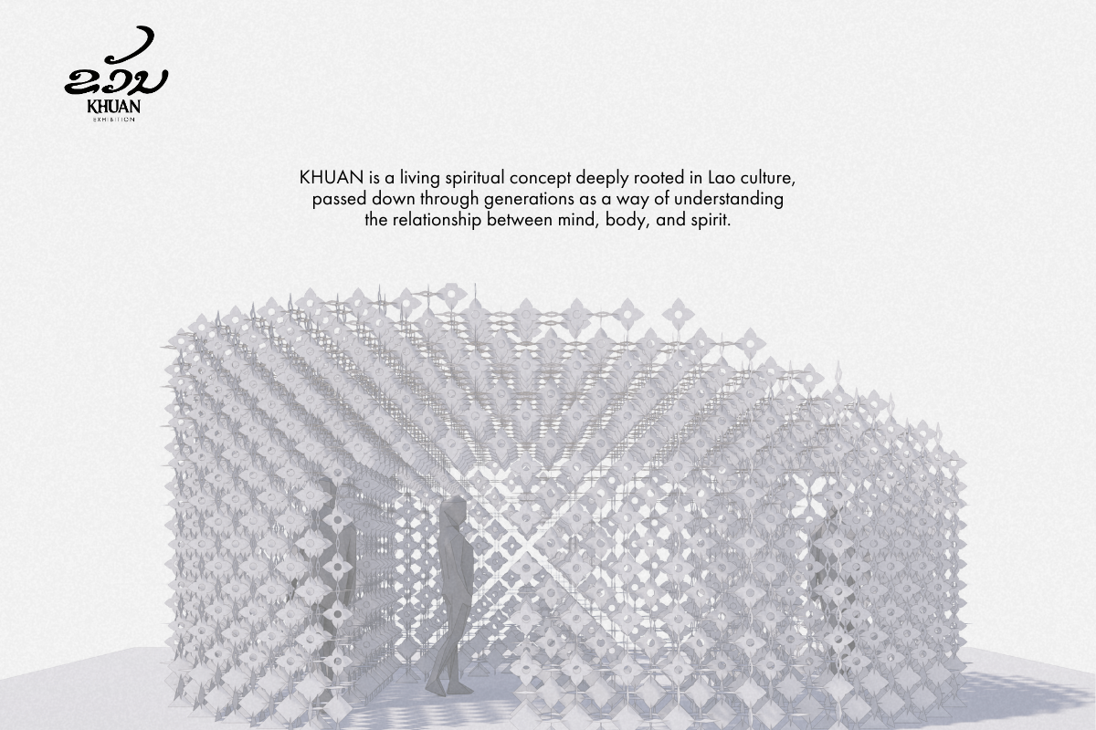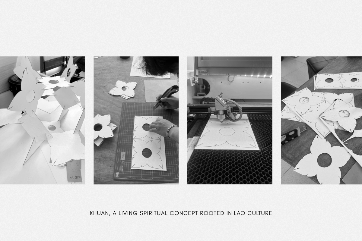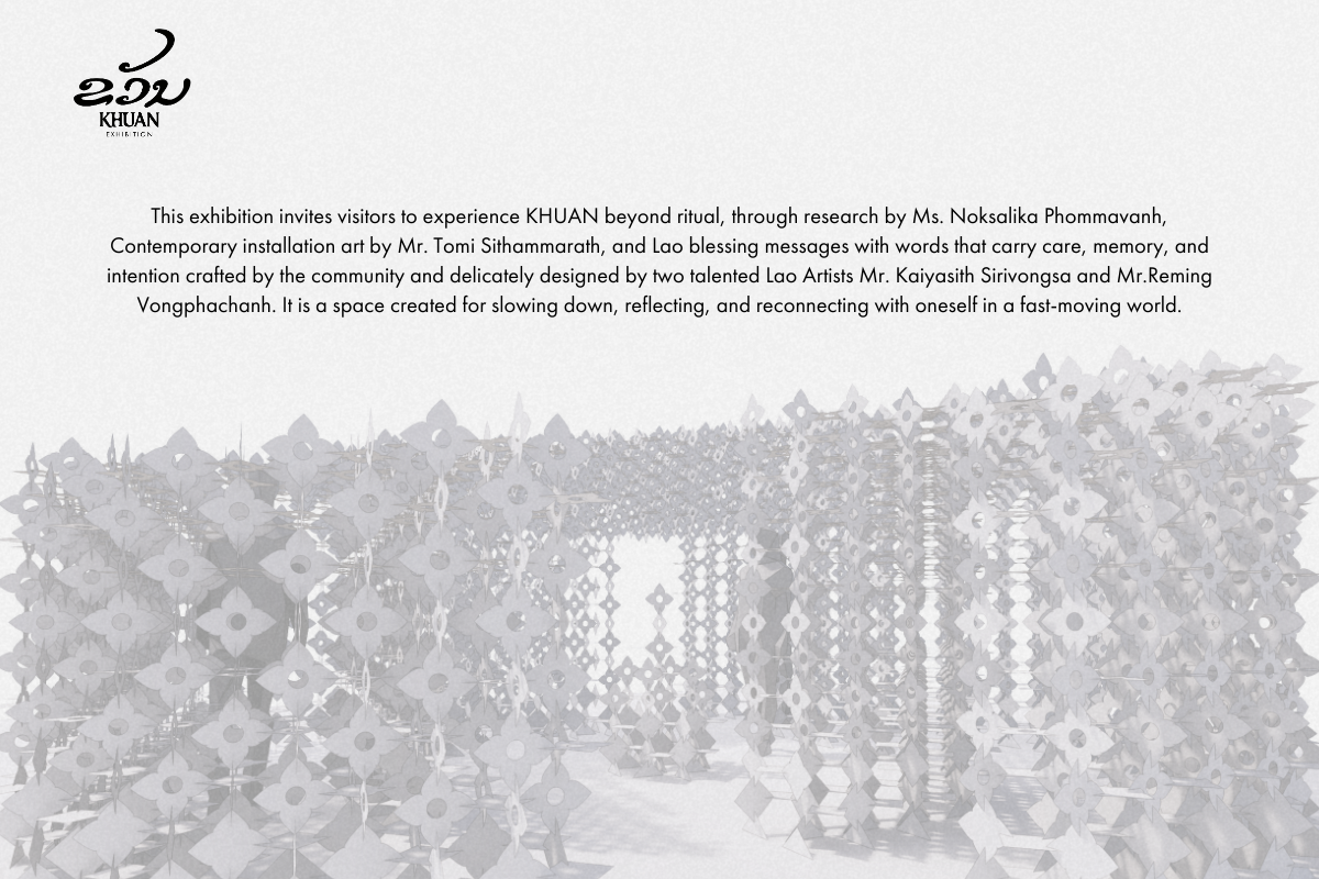 This exhibition invites visitors to experience KHUAN beyond ritual, through research by Ms. Noksalika Phommavanh, contemporary installation art by Mr. Tomi Sithammarath, and Lao blessing messages with words that carry care, memory, and intention crafted by the community and delicately designed by two talented Lao artists, Mr. Kaiyasith Sirivongsa and Mr. Reming Vongphachanh. It is a space created for slowing down, reflecting, and reconnecting with oneself in a fast-moving world.